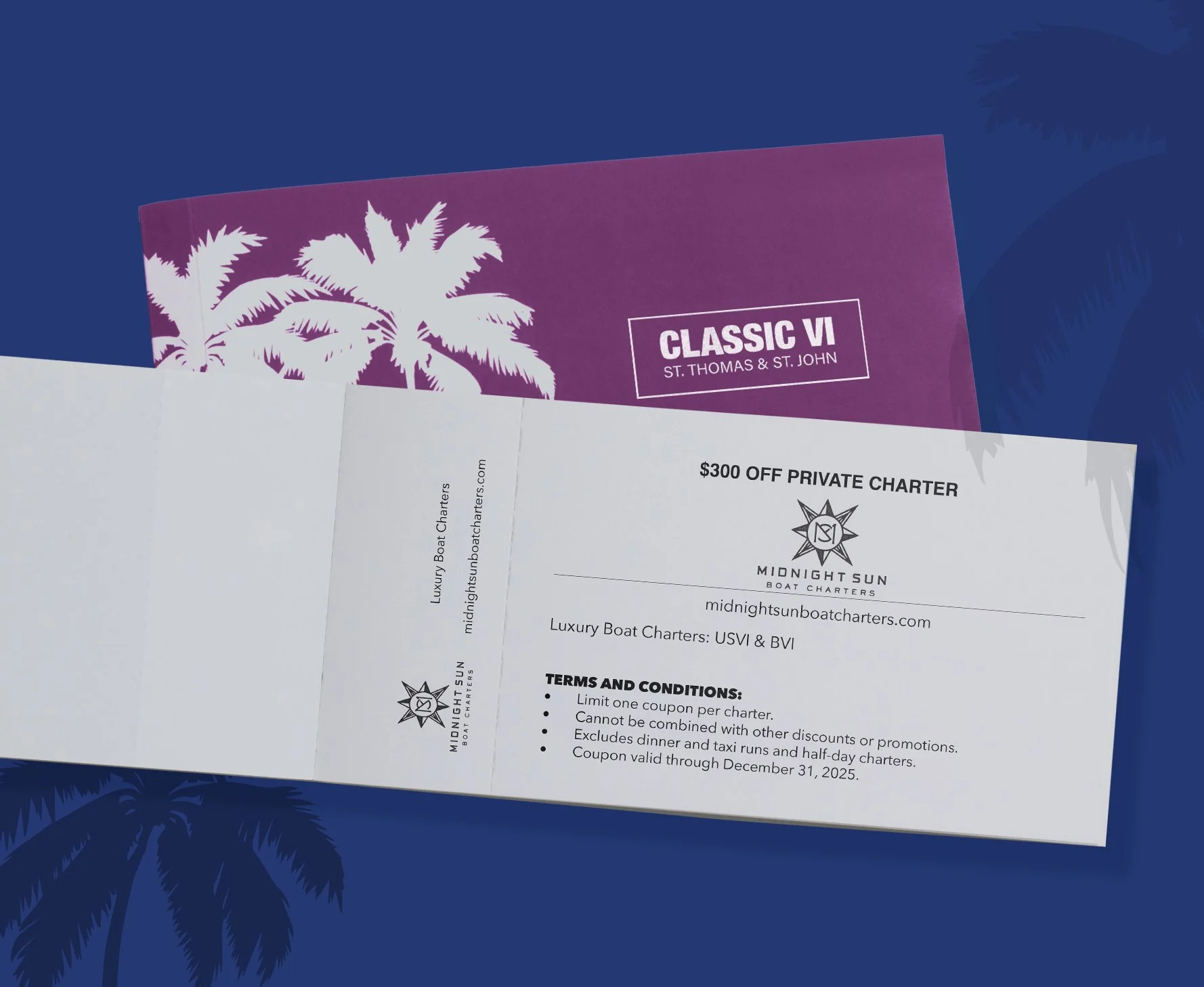 Experience St. Thomas and St. John like never before with our Classic VI Coupon Book. Access 56 coupons worth $1700 covering dining, boating, cultural activities, wellness, and retail.